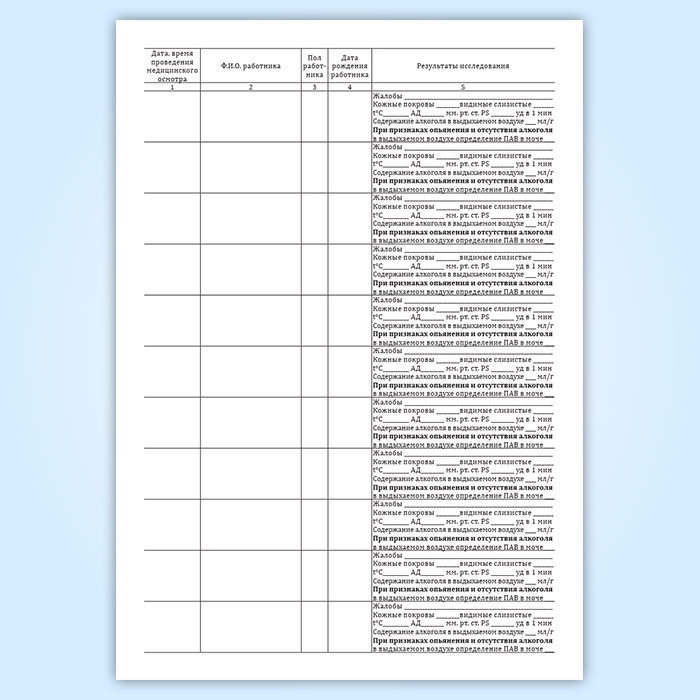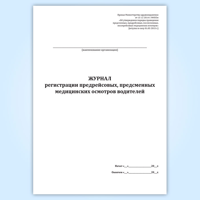 Форма журнала регистрации предрейсовых, предсменных медицинских осмотров водителей разработана на основании Приказа Министерства здравоохранения Российской Федерации (Минздрав России) от 15 декабря 2014 г. N 835н г. Москва "Об утверждении Порядка проведения предсменных, предрейсовых и послесменных, послерейсовых медицинских осмотров", но имеет более расширенные графы «Результаты исследования» и «Заключение о результате медицинского осмотра».