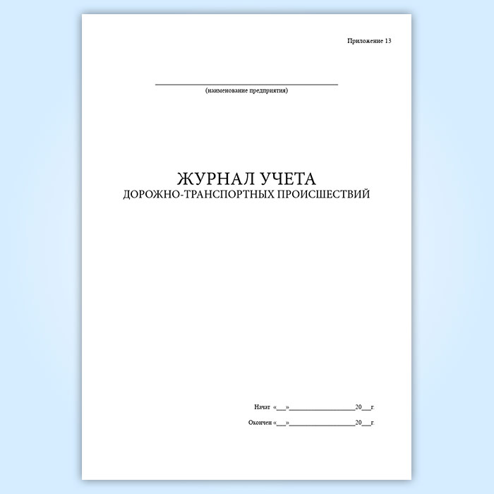 Форма журнала учета дорожно-транспортных происшествий соответствует Приложению 13 к РД 39-22-637-81 Система организации и управления комплексом работ по обеспечению безопасности дорожного движения на транспорте нефтяной промышленности.
