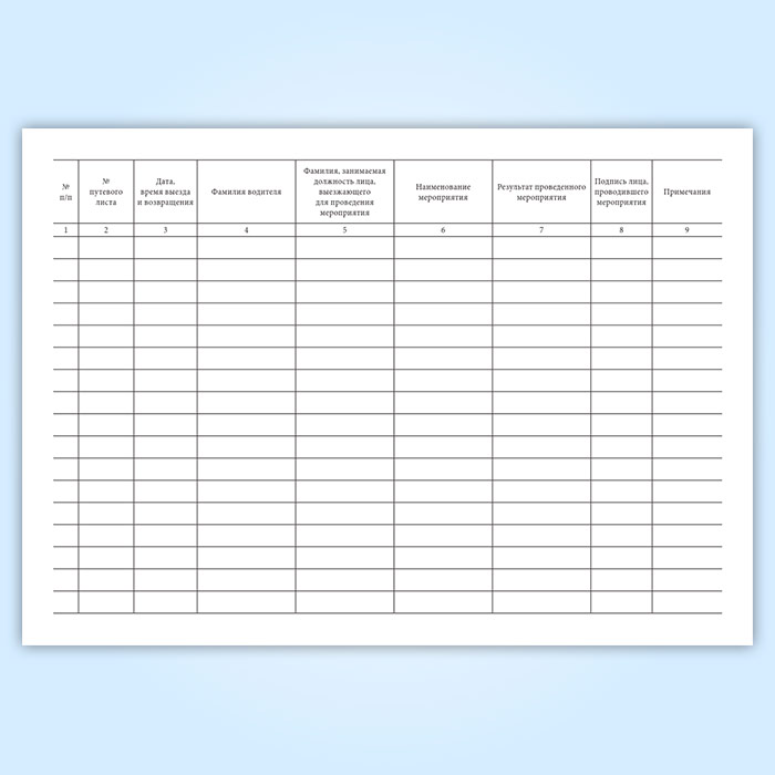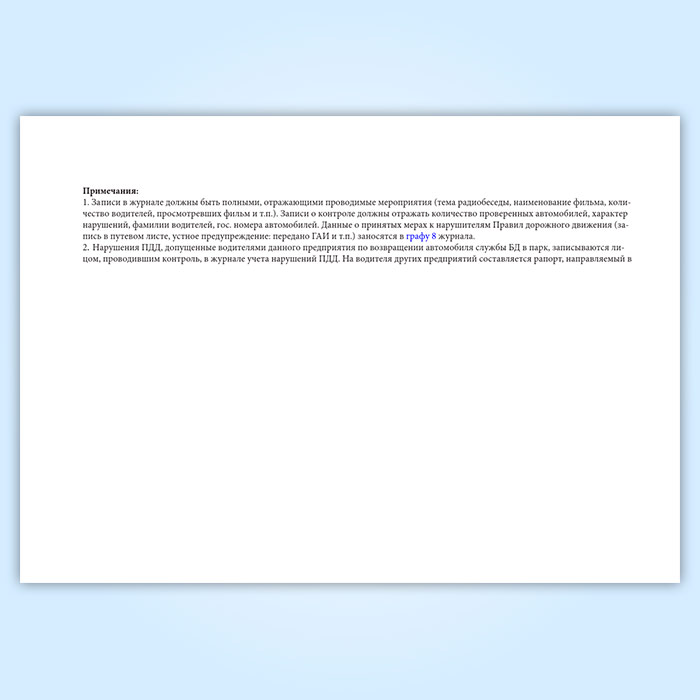 Учет работы автомобиля службы безопасности движения ведется по установленной форме в специальном журнале. Записи в журнале должны быть полными, отражающими проводимые мероприятия (тема радиобеседы, наименование фильма, количество водителей, просмотревших фильм и т.п.). Записи о контроле должны отражать количество проверенных автомобилей, характер нарушений, фамилии водителей, гос. номера автомобилей. Данные о принятых мерах к нарушителям Правил дорожного движения (запись в путевом листе, устное предупреждение: передано ГАИ и т.п.) - заносятся в графу 8 журнала.