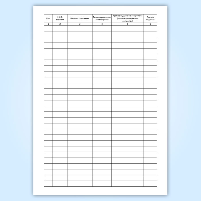 Графы журнала учета инструктажа водителей, убывающих в командировку: