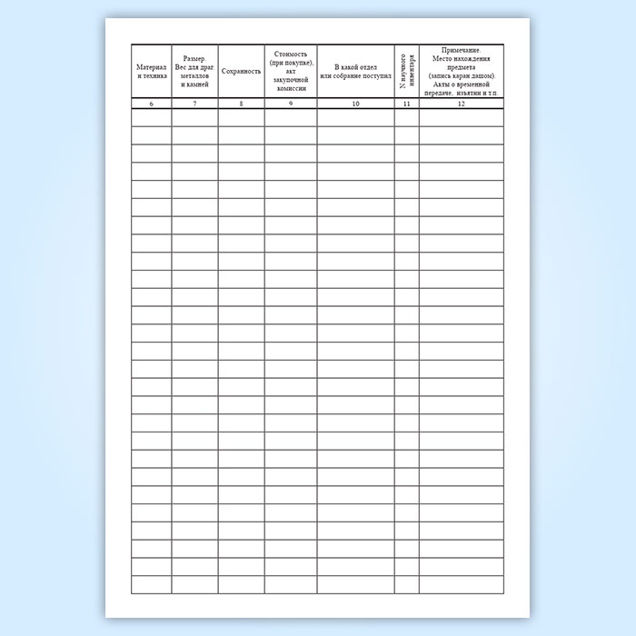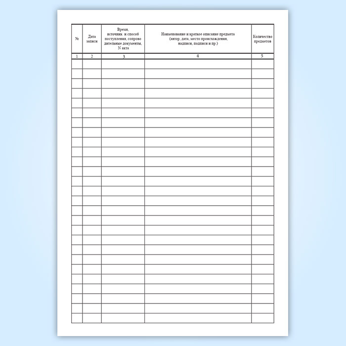 Книга поступлений предметов научно-вспомогательного фонда на постоянное хранение (для музеев, кроме художественных) имеет графы: