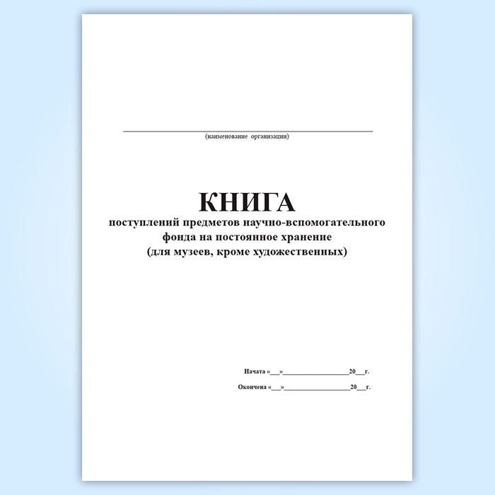 Форма Книги поступлений предметов научно-вспомогательного фонда на постоянное хранение (для музеев, кроме художественных) соответствует Приложению 9а к Приказу Минкультуры СССР № 290 «Об утверждении Инструкции по учету и хранению музейных ценностей, находящихся в государственных музеях СССР».