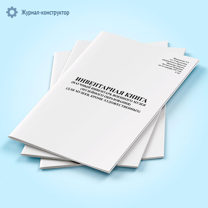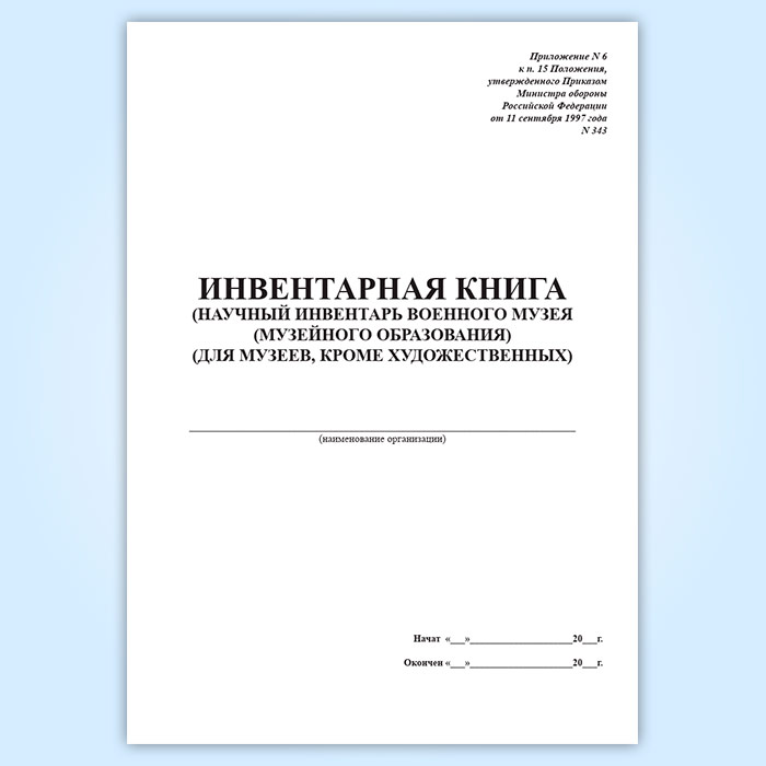 Форма Инвентарной книги (научный инвентарь военного музея (музейного образования) (для музеев, кроме художественных) соответствует Приложению 6 к Приказу Минобороны РФ № 343 "Об утверждении Положения о музеях, образованиях музейного типа и комнатах воинской славы Вооруженных Сил Российской Федерации" от 11.09.1997 года.