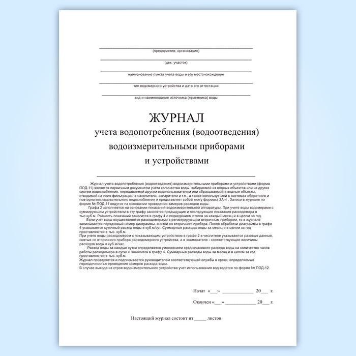 Форма журнала учета водопотребления-водоотведения водоизмерительными приборами и устройствами № ПОД-11 соответствует инструкции Минводхоза СССР от 01.07.1986 № ИВН 33-5.4.01-86