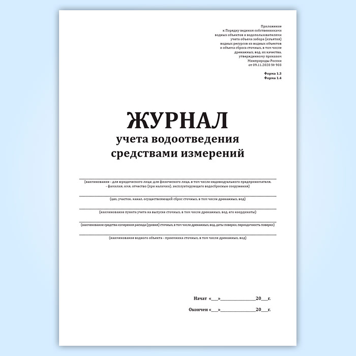 Форма журнала учета водоотведения средствами измерений соответствует Приложению (ф. 1.3, 1.4) к Приказу Минприроды России от 09.11.2020 N 903 "Об утверждении Порядка ведения собственниками водных объектов и водопользователями учета объема забора (изъятия) водных ресурсов из водных объектов и объема сброса сточных, в том числе дренажных, вод, их качества"