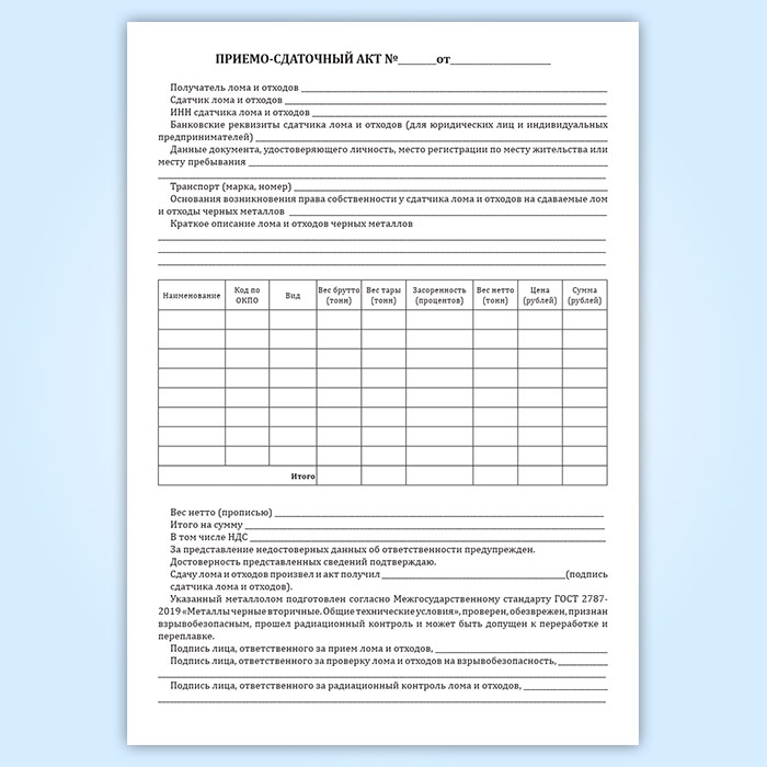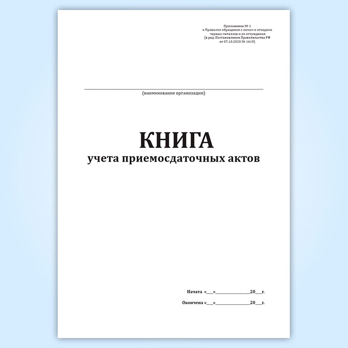 Книга учета состоит из приемосдаточных актов, форма которых соответствует Приложению 1 к Постановлению Правительства РФ от 11.05.2001 № 369 " Об утверждении Правил обращения с ломом и отходами черных металлов и их отчуждения"