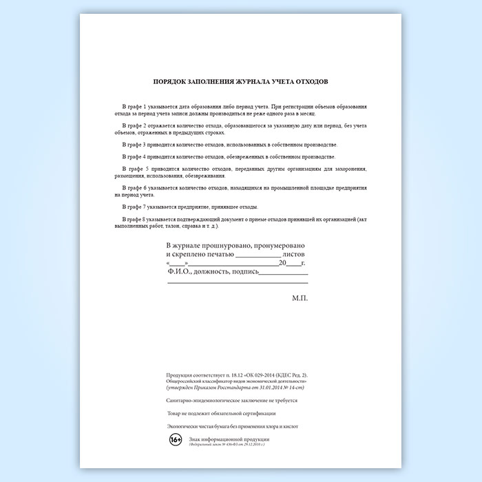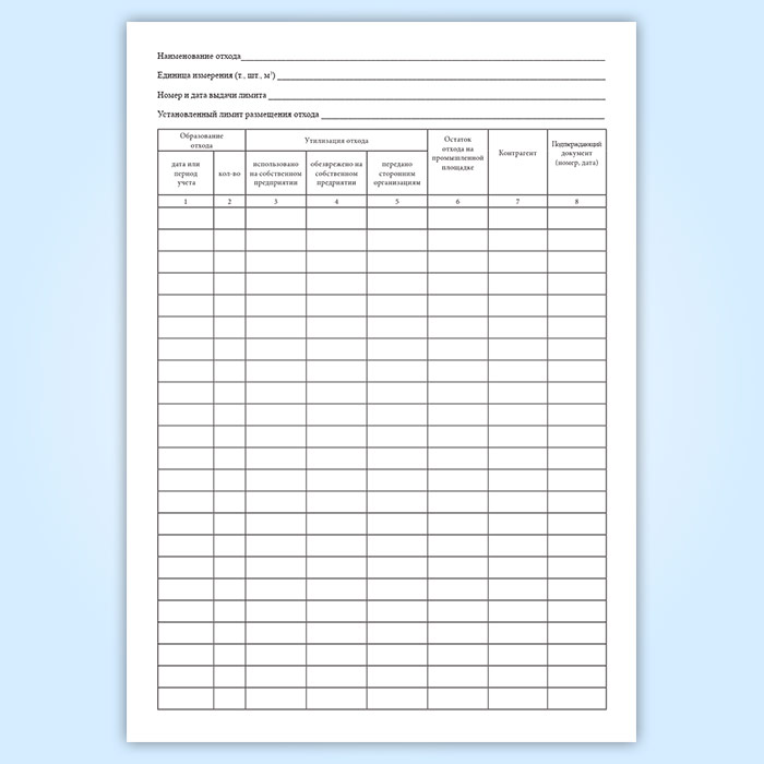 Форма журнала используется для организации на объектах первичного учета образовавшихся, использованных, обезвреженных, переданных другим лицам или полученных от других лиц, а также размещенных отходов.