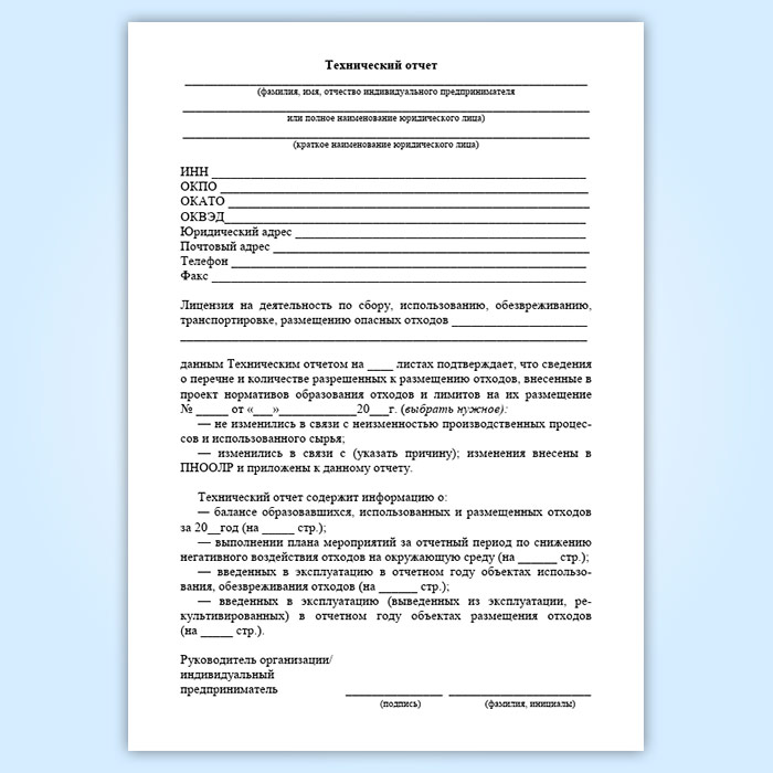 Форма Технического отчета о неизменности производственного процесса, используемого сырья и об обращении с отходами утверждена Приказом Ростехнадзора от 19 октября 2007 г. № 703 "Об утверждении методических указаний по разработке проектов нормативов образования отходов и лимитов на их размещение", который утратил силу.