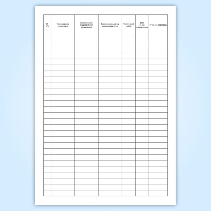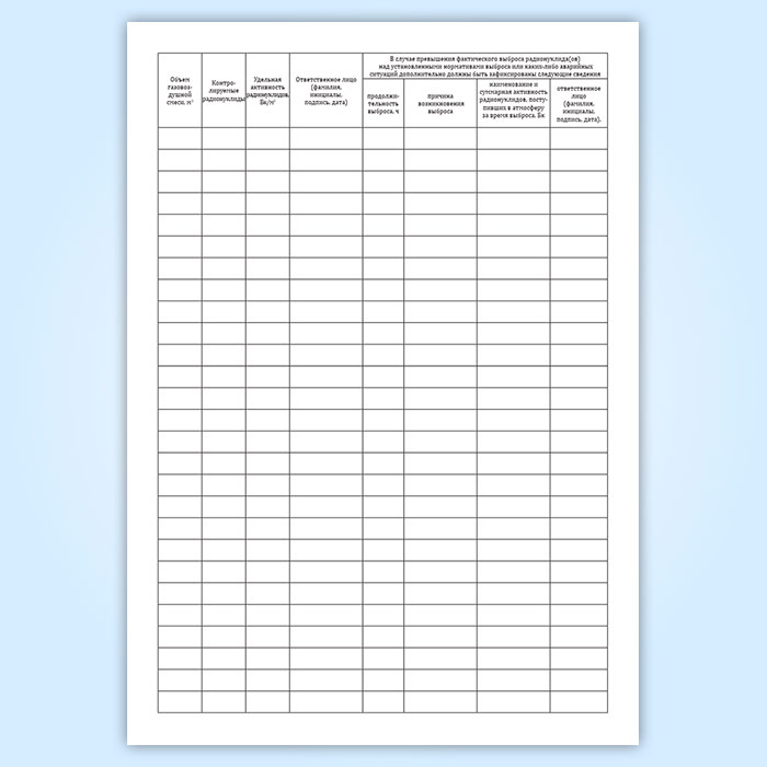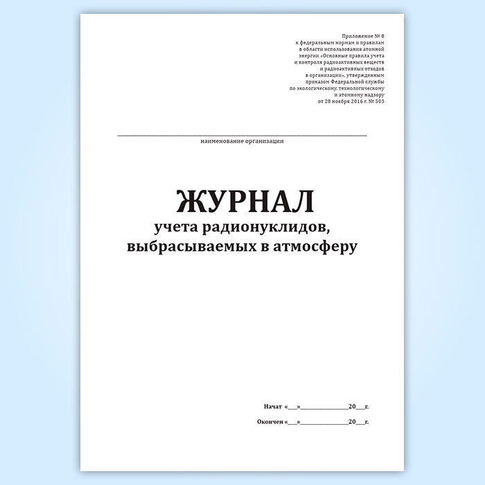 Форма журнала учета радионуклидов, выбрасываемых в атмосферу соответствует Приложению 8 к НП-067-16 Основные правила учета и контроля радиоактивных веществ и радиоактивных отходов в организации.
