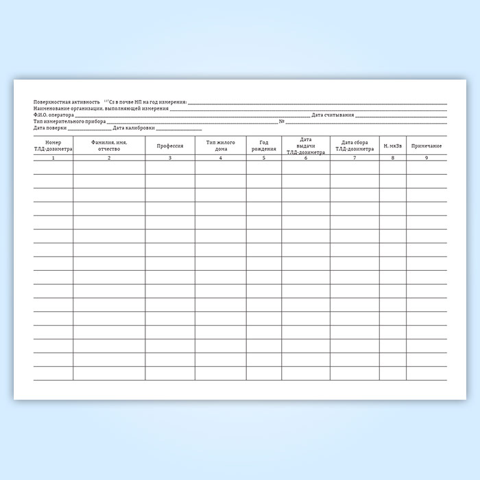 Форма журнала соответствует Приложению 4 к " МР 2.6.1.0006-10. 2.6.1. Ионизирующее излучение. радиационная безопасность. Проведение комплексного экспедиционного радиационно-гигиенического обследования населенного пункта для оценки доз облучения населения. Методические рекомендации".