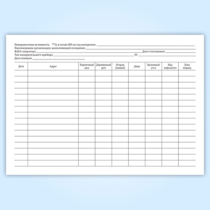Форма журнала соответствует Приложению 4 к " МР 2.6.1.0006-10. 2.6.1. Ионизирующее излучение. радиационная безопасность. Проведение комплексного экспедиционного радиационно-гигиенического обследования населенного пункта для оценки доз облучения населения. Методические рекомендации".