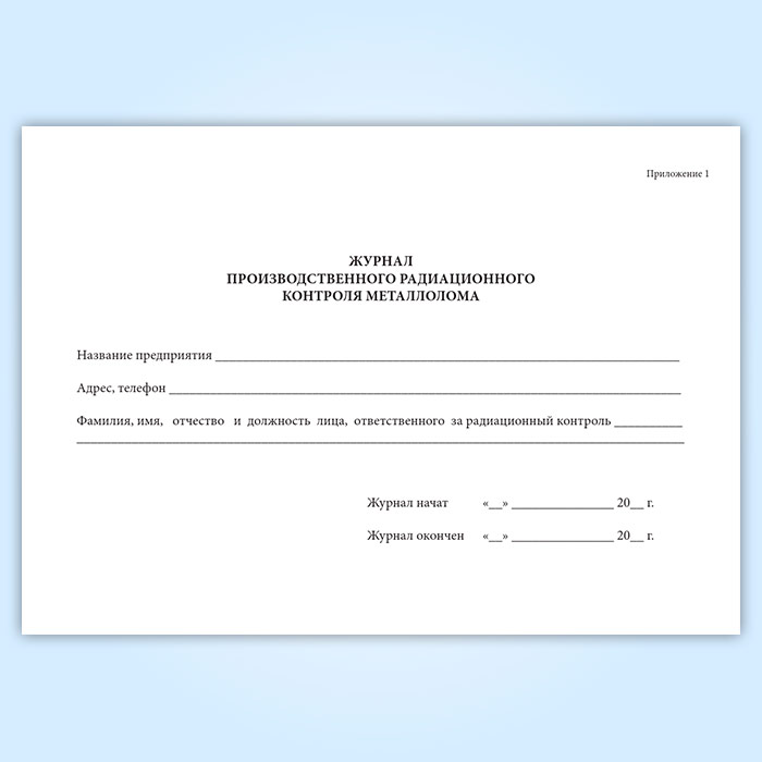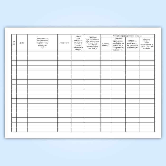 Форма журнала соответствует Приложению к МУК 2.6.1.1087-02 Радиационный контроль металлолома и Приложению 1 к СанПиН 2.6.1.993-00 Гигиенические требования к обеспечению радиационной безопасности при заготовке и реализации металлолома.