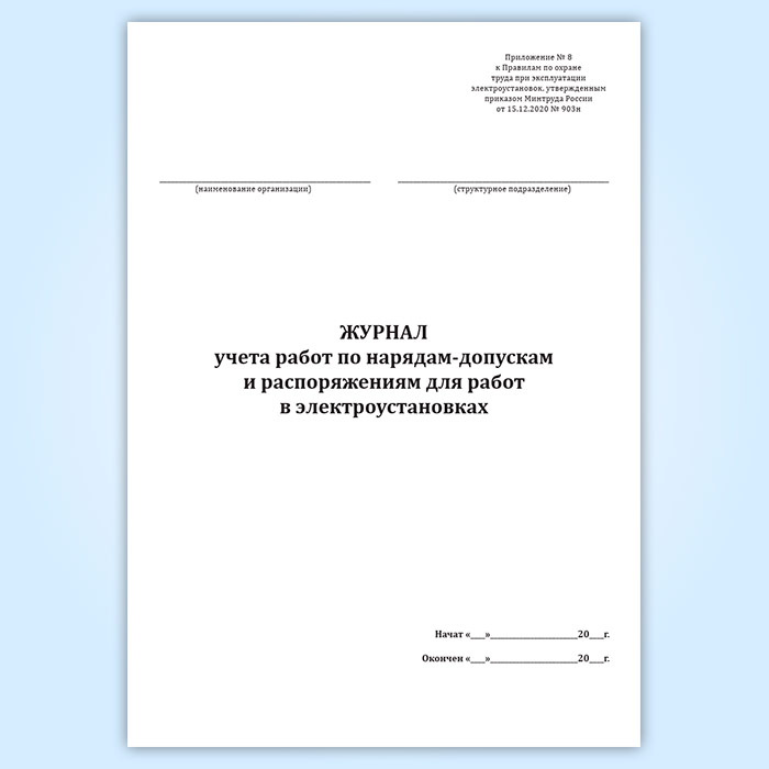 Форма журнала учета работ по нарядам-допускам и распоряжениям для работы в электроустановках соответствует Приложению № 8 к Правилам по охране труда при эксплуатации электроустановок