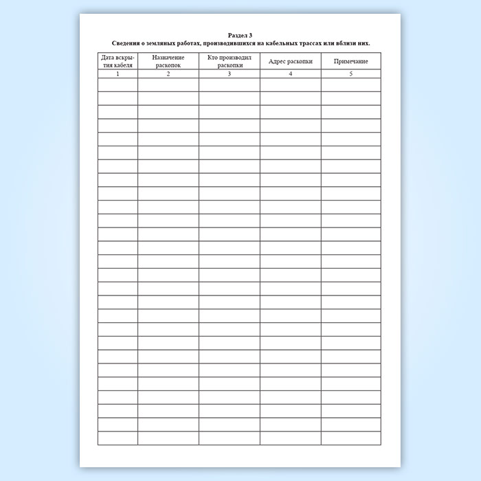 Раздел 3 Сведения о земляных работах, производившихся на кабельных трассах или вблизи них имеет графы: