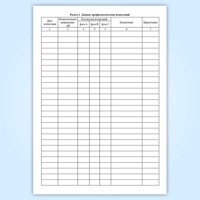 Раздел 1 Данные профилактических испытаний имеет графы:
