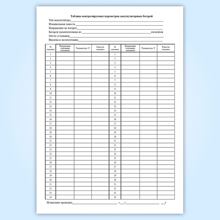 В процессе эксплуатации АКБ производятся работы по обслуживанию. Эти даные специалист должен вносить в журнал по обслуживанию аккумуляторной батареи. Вести журнал нужно для каждой аккумуляторной батареи в отдельности, записывая данные контрольных измерений состояния батарей.