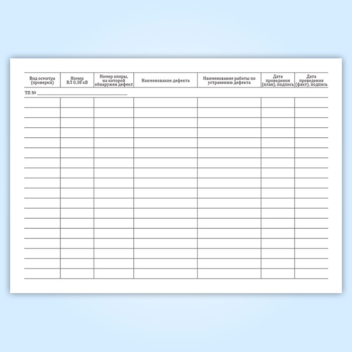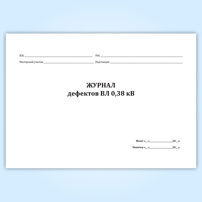 Форма журнала дефектов ВЛ 0,38 кВ соответствует Приложению Д к РД 153-34.3-20.573-2001 " Указания по учету и анализу в энергосистемах технического состояния распределительных сетей напряжением 0,38-20 кВ с воздушными линиями электропередачи" .