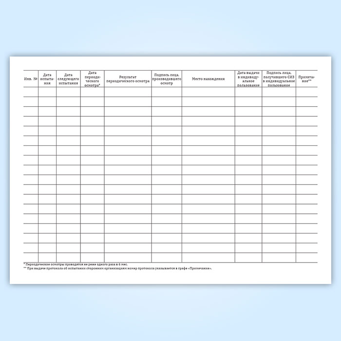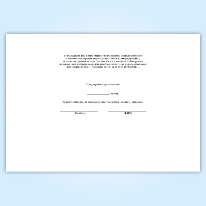 Форма журнала дана в соответствии с приложением 1 Правил применения и использования средств защиты, используемых в электроустановках, технические требования к ним. Издание 9-е и приложением 1 к Инструкции по применению и испытанию средств защиты, используемых в электроустановках утверждена приказом Минэнерго России от 30 июня 2003 г. №261.
