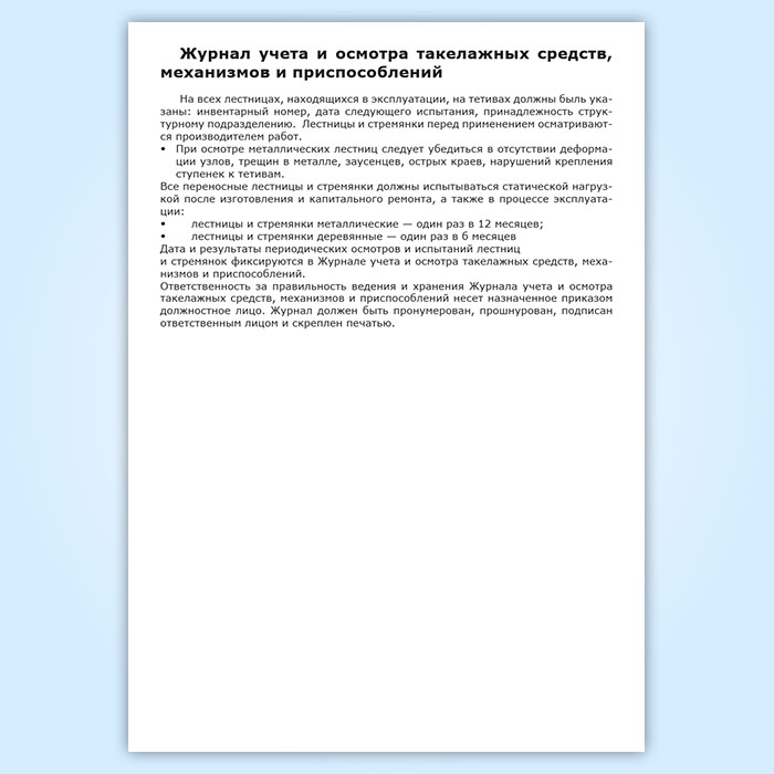 Обязательное ведение журнала учета и осмотра такелажных средств, механизмов и приспособлений закреплено также внутренними документами РАО "ЕЭС России", РЖД и пр.