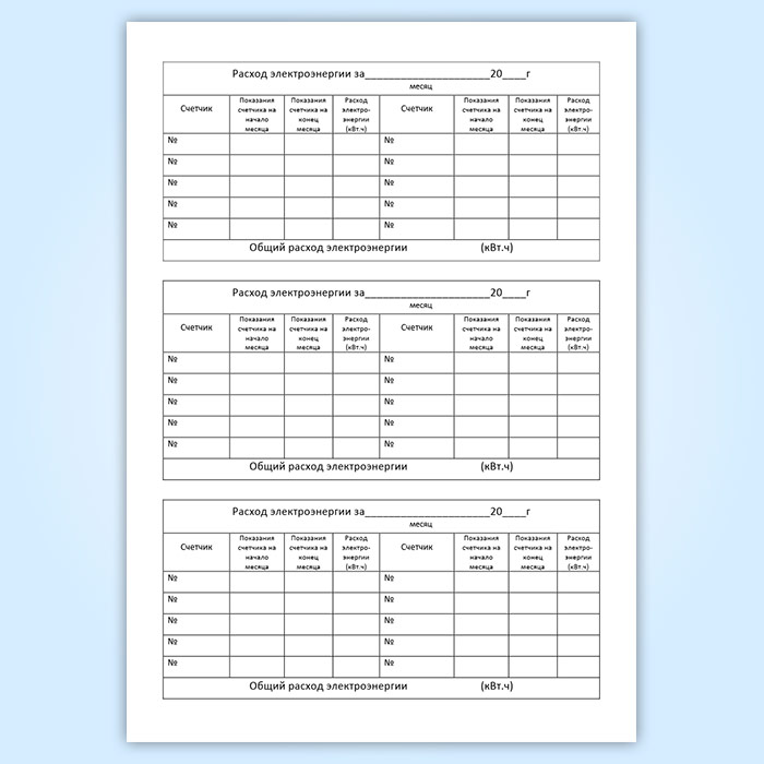 Журнал учета потребления электроэнергии нужен для регистрации показаний приборов учета (электросчетчиков). В журнале должен быть указан тип и номер счётчика, и далее показания прибора учета на начало месяца и на конец месяца, чтобы определить количество потребленной абонентом электроэнергии. Записи вносятся в журнал с указанием даты записи и наименования присоединения, а также фамилия и подпись лица, снимающего показания. Журнал учета потребления электроэнергии должен быть пронумерован, прошнурован и опечатан ответственным лицом. Учет электроэнергии, расчетный – используется для учета отпущенной и выработанной электроэнергии потребителем при расчете оплаты за нее. Для подсчета потребляемой энергии устанавливаются расчетные счетчики. Учет электроэнергии, контрольный – используется для учета и контроля за расходом электроэнергии на подстанциях, электростанциях, предприятиях, в квартирах и т.д. При внесении записей в журнал обязательно указывается дата снятия данных, Ф.И.О. лица, снимающего показания и его подпись. Журнал учета расхода электроэнергии значительно облегчает учет и контроль за расходом электричества, как на предприятиях, так и для не промышленных потребителей.