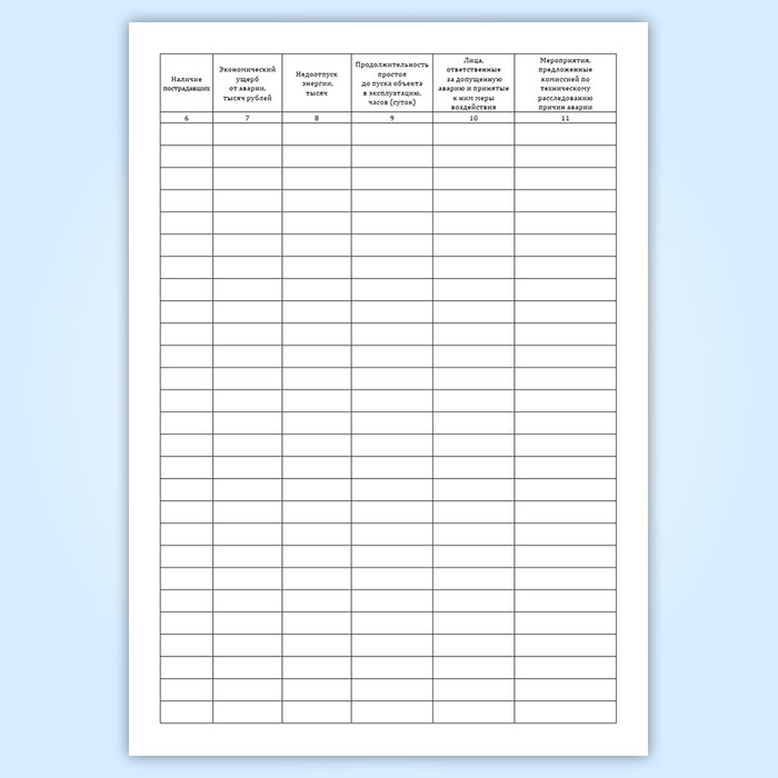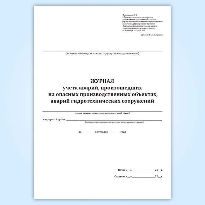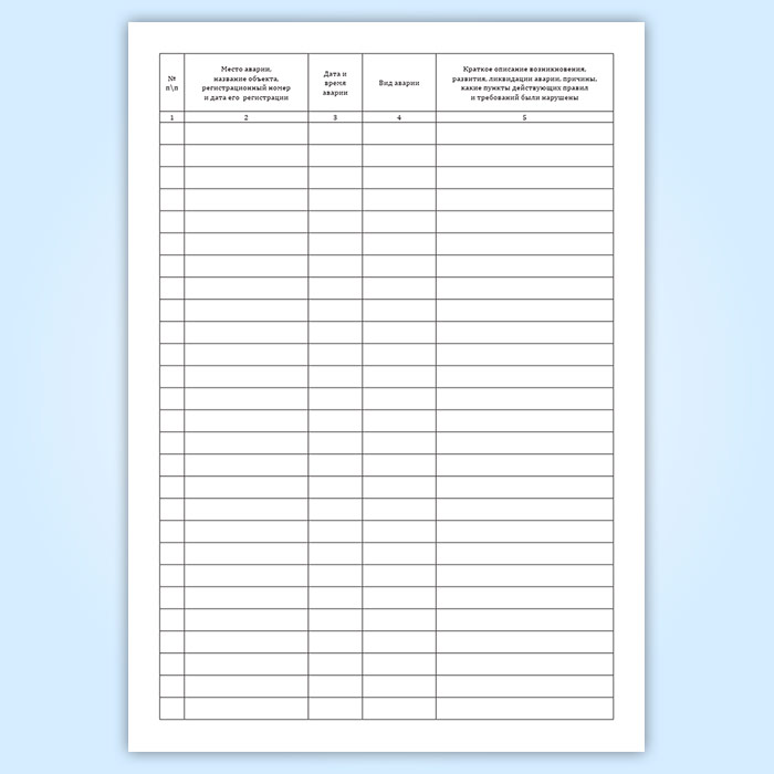 Форма журнала учета аварий, произошедших на опасных производственных объектах энергетики и гидросооружениях, соответствует Приложению 4 Порядку проведения технического расследования причин аварий, инцидентов и случаев утраты взрывчатых материалов промышленного назначения.