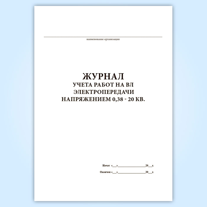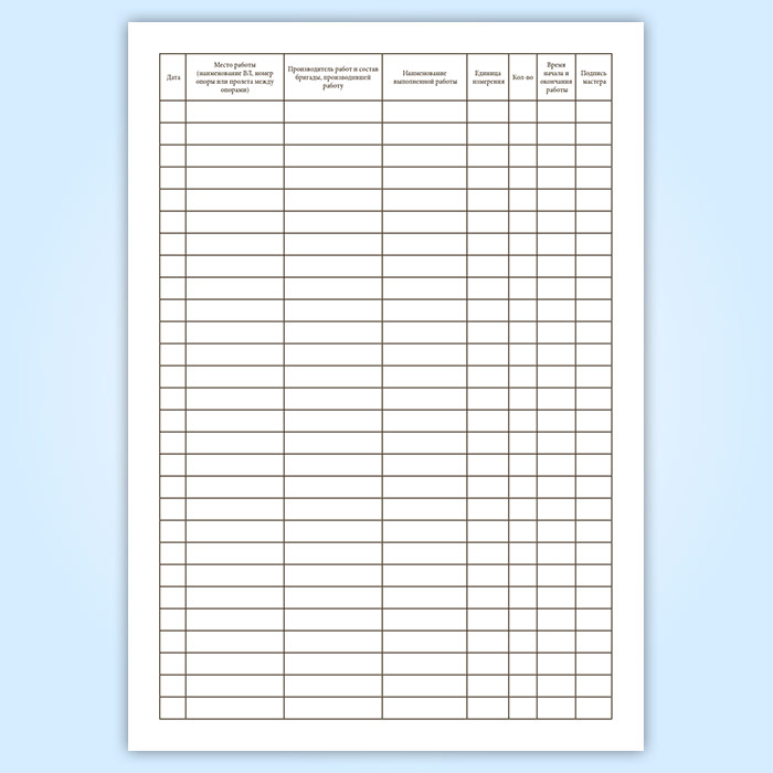 Форма журнала учета работ на ВЛ электропередачи напряжением 0,38-20 кВ соответствует Приложению 10 к Типовой инструкции по техническому обслуживанию и ремонту воздушных линий электропередачи напряжением 0,38-20 кВ с неизолированными проводами. РД 153-34.3-20.662-98.