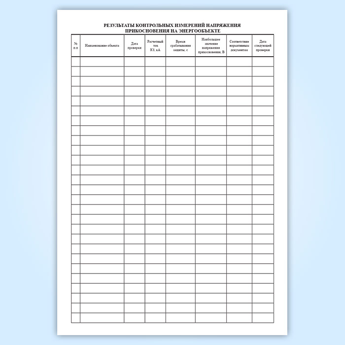 Результаты контрольных измерений напряжения прикосновения на энергообъекте. Графы: