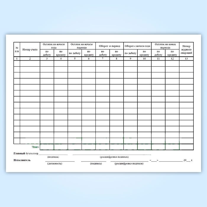 В Главной книге (ф. 0504072) подсчитывается общий итог оборотов за период с начала года. По всем счетам выводятся дебетовые или кредитовые остатки на начало следующего периода. При этом сумма оборотов за период, а также сумма остатков на начало следующего периода по дебету всех счетов должны быть равны сумме оборотов или остатков по кредиту всех счетов.