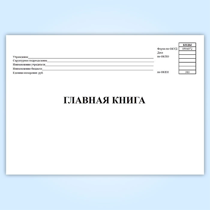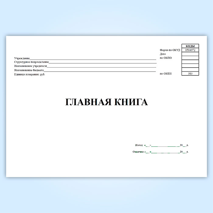 Форма Главной книги (код формы 0504072) соответствует Приказу Министерства финансов Российской Федерации (Минфин России) от 15 декабря 2010 г. N 173н г. Москва "Об утверждении форм первичных учетных документов и регистров бухгалтерского учета, применяемых органами государственной власти (государственными органами), органами местного самоуправления, органами управления государственными внебюджетными фондами, государственными академиями наук, государственными (муниципальными) учреждениями и Методических указаний по их применению", а также соответствует Приложению 1 к Приказу от 28 марта 2008 г. N 139 Формы документов, используемых в финансово-хозяйственной деятельности Вооруженных Сил Российской Федерации и утверждена Приказом от 30.03.2015 N 52н Об утверждении форм первичных учетных документов и регистров бухгалтерского учета, применяемых органами государственной власти (государственными органами), органами местного самоуправления, органами управления государственными внебюджетными фондами, государственными (муниципальными) учреждениями, и Методических указаний по их применению.
