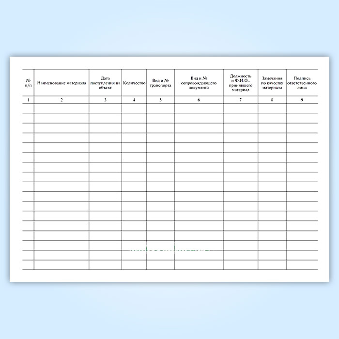 При заполнении журнала контроля обязательно вести порядковую нумерацию записей. Помимо наименования, количества и даты поступления материала, также прописывают вид и номер транспорта, а также реквизиты сопроводительных документов.