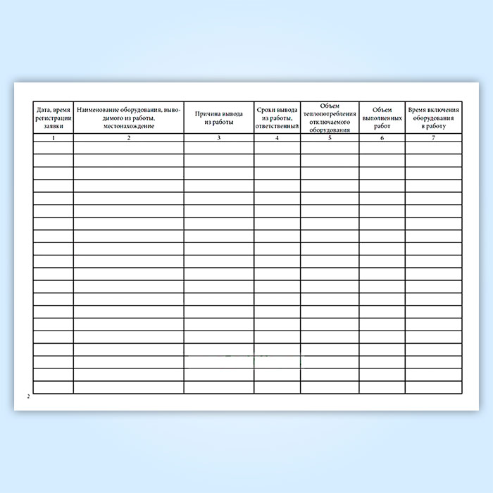 Форма данного журнала предназначена для регистрация заявок на вывод оборудования тепловых энергоустановок из работы с указанием наименования оборудования, причины и времени вывода его из работы (подачи заявки), а также объема теплопотребления отключаемого оборудования.