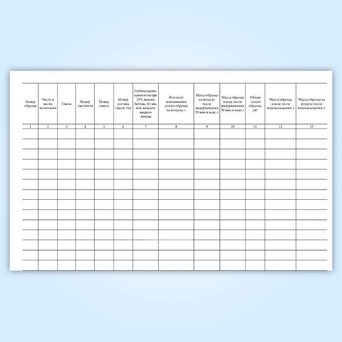 Форма журнала испытания проб асфальтобетонных смесей, взятых из смесителя (№10) соответствует Приложению 1 к Пособию по строительству асфальтобетонных покрытий и оснований автомобильных дорог и аэродромов (к СНиП 3.06.03-85 и СНиП 3.06.06-88).