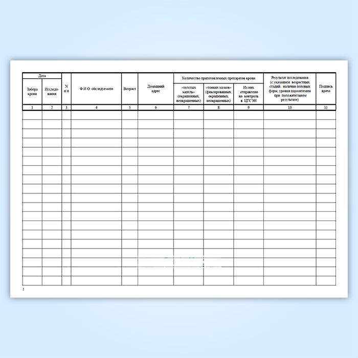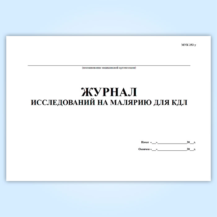Форма журнала исследований на малярию для КДЛ соответствует Методическим указаниям по методам контроля (МУК 3.2.987-00) «Паразитологическая диагностика малярии», которые были утверждены Главным государственным санитарным врачом РФ от 19 октября 2000 года, в настоящее время отмененного.