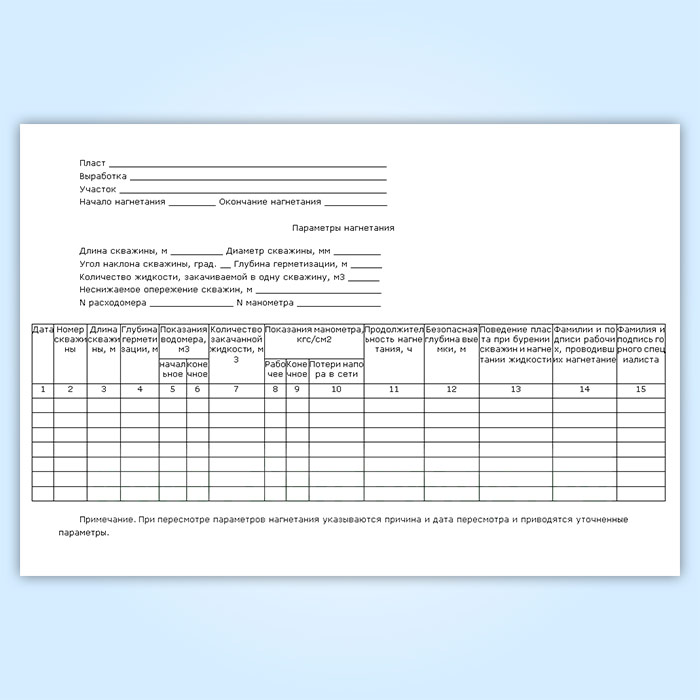 Форма Журнала контроля и учета работ по нагнетанию жидкости в угольный пласт соответствует Приложению14 к Рекомендациям по безопасному ведению горных работ на склонных к динамическим явлениям угольных пластах.