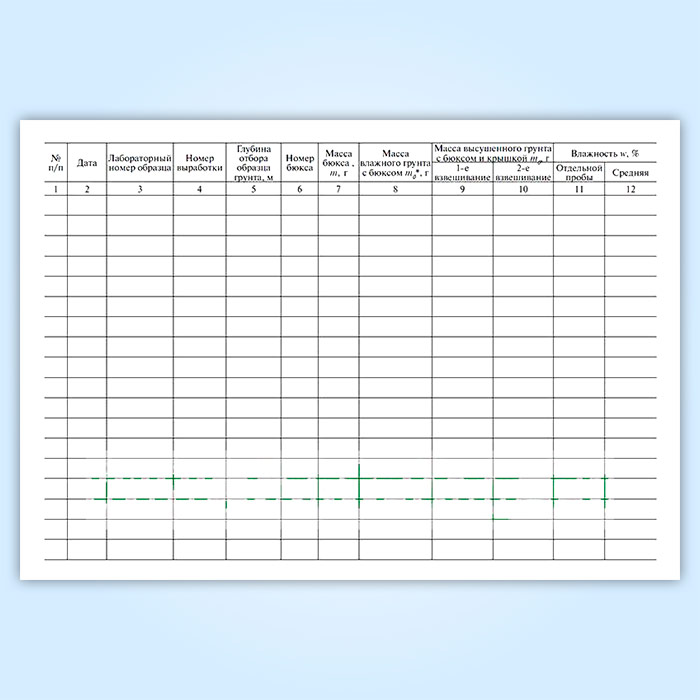 Форма журнала определения влажности грунта соответствует Приложению Б к ГОСТу 5180-2015 Грунты. Методы лабораторного определения физических характеристик