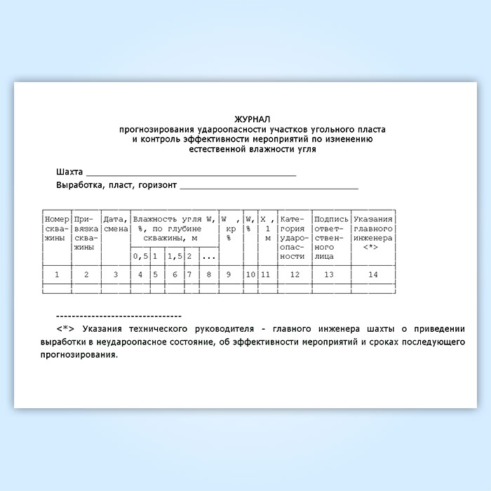 Форма Журнала прогнозирования удароопасности участков угольного пласта и контроля эффективности мероприятий по изменению естественной влажности угля соответствует РД 05-328-99 Инструкции по безопасному ведению горных работ на шахтах, разрабатывающих угольные пласты, склонные к горным ударам, утвержденная Постановлением Госгортехнадзора РФ от 29.11.1999 N 87.