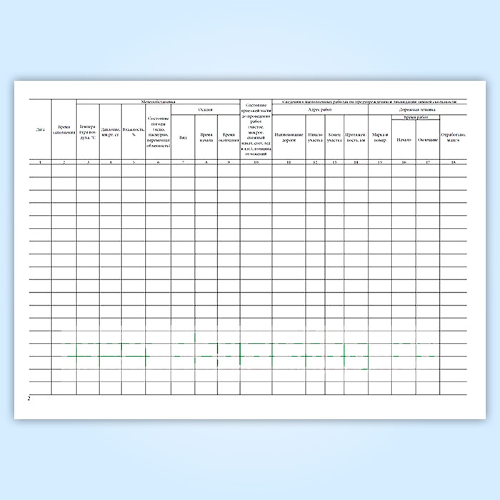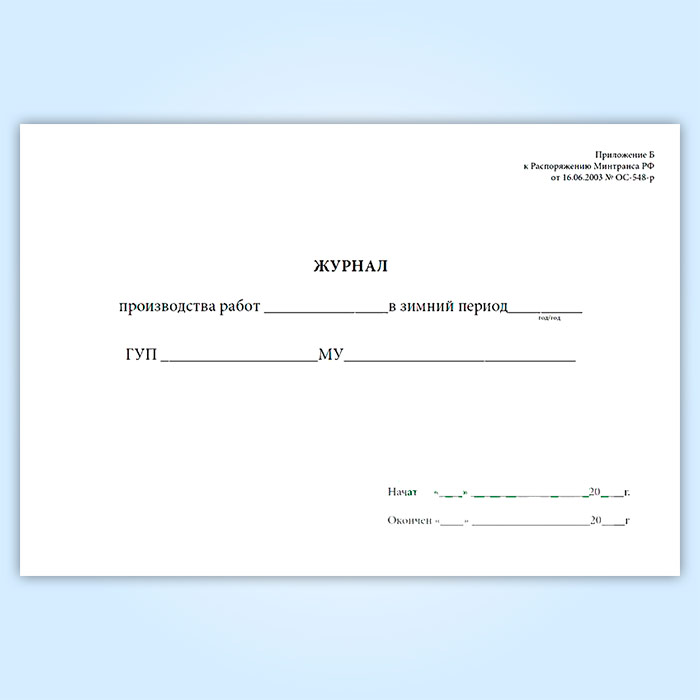 Форма журнала производства работ в зимний период, выполненных за время дежурства соответствует Приложению Б Руководства по борьбе с зимней скользкостью на автомобильных дорогах" , утвержденным распоряжением Минтранса РФ от 16.06.2003 № ОС-548-р.