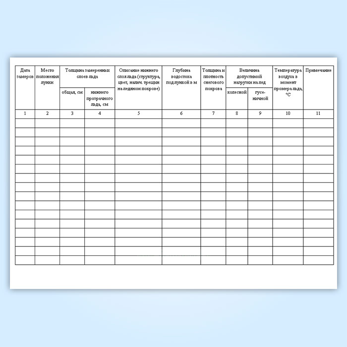 Форма журнала промеров толщины льда и определения грузоподъемности ледяного покрова соответствует Приложению 29 к РД 39-22-637-81 Система организации и управления комплексом работ по обеспечению безопасности дорожного движения на транспорте нефтяной промышленности.