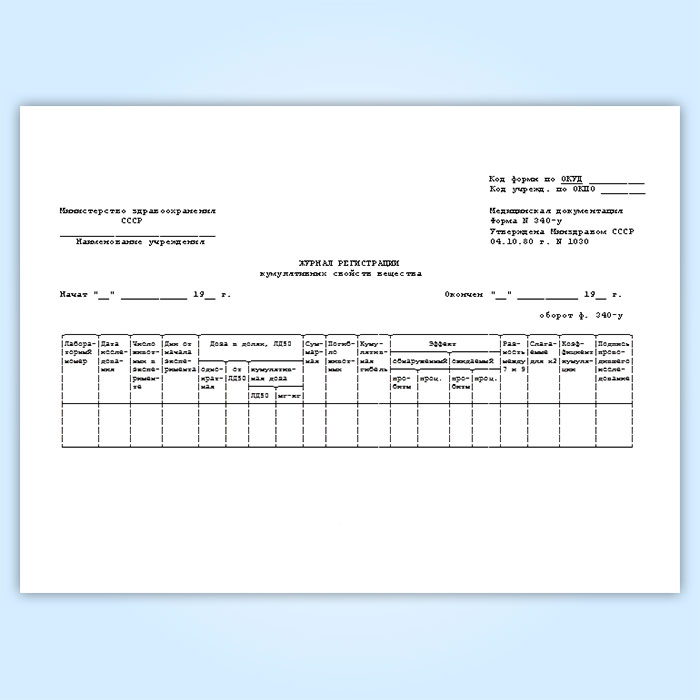 Форма журнала регистрации кумулятивных свойств вещества (Форма N 340-у) утверждена приказом Минздрава СССР №1030 " Об утверждении форм первичной медицинской документации учреждений здравоохранения" .