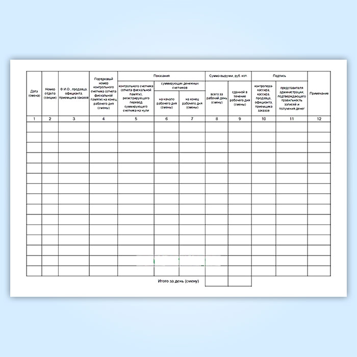 Журнал регистрации показаний суммирующих денежных и контрольных счетчиков контрольно-кассовых машин, работающих без кассира-операциониста форма КМ-5 применяется в организациях, работающих без кассира-операциониста (в случае установки ККМ на прилавках магазинов или для работы официанта), для учета операций по приходу наличных денег (выручки) по каждой контрольно-кассовой машине, а также является контрольно-регистрационным документом показаний счетчиков. Журнал должен быть прошнурован, пронумерован и скреплен подписями налогового инспектора, руководителя и главного (старшего) бухгалтера организации и печатью.
