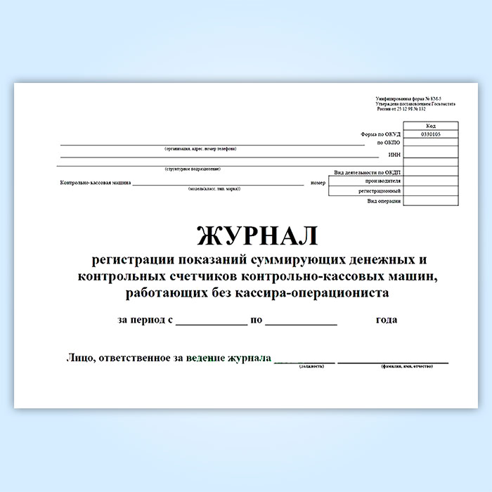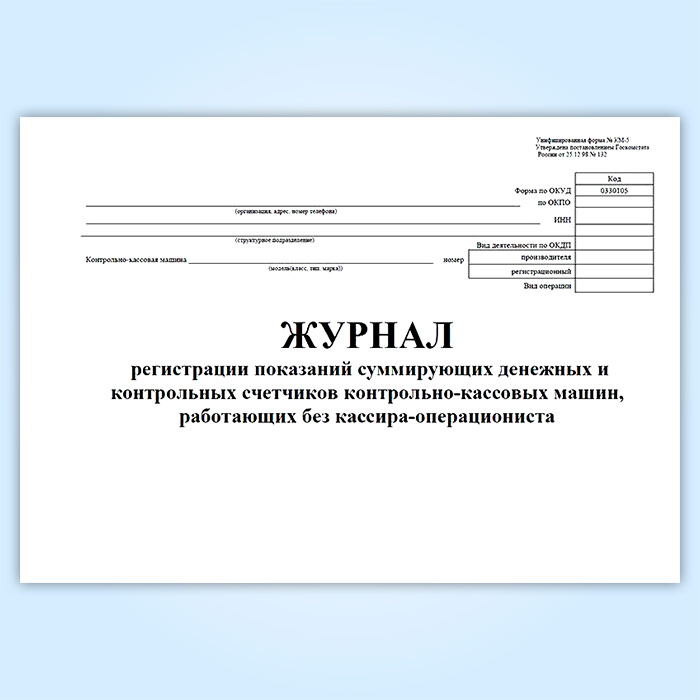 Журнал регистрации показаний суммирующих денежных и контрольных счетчиков контрольно-кассовых машин, работающих без кассира-операциониста (Форма КМ-5) соответствует Постановлению Госкомстата РФ от 25.12.1998 № 132 " Об утверждении унифицированных форм первичной учетной документации по учету торговых операций"