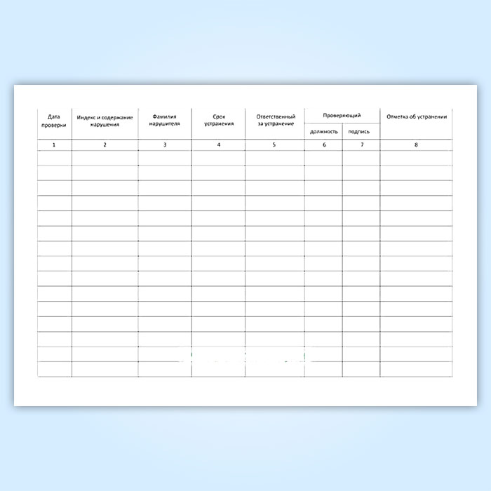Проверка проводится в объеме классификатора возможных нарушений требований безопасности труда в бригаде. Все нарушения, допущенные рабочими-членами бригады, устраняются немедленно. Фамилия нарушителя с указанием характера нарушения и его индекса по классификатору заносятся в журнал. Если одно и то же нарушение совершили двое или больше рабочих, в журнале записывается фамилия каждого. (Журнал хранится у бригадира).