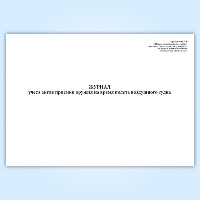 Форма журнала учета актов приемки оружия на время полета воздушного судна соответствует Приложению № 8 к Правилам проведения досмотра, дополнительного досмотра, повторного досмотра в целях обеспечения транспортной безопасности.