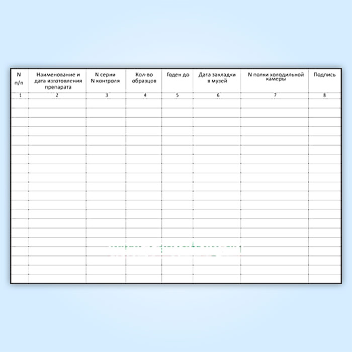 Форма журнала учета архивных образцов препаратов и регистрации результатов их контроля соответствует Приложению 1 Положениия о музее архивных образцов ветеринарных препаратов отдела (отделения) биологического контроля (ОБТК) организации (предприятия)* (утв. Главным государственным ветеринарным инспектором Российской Федерации 19 апреля 1995 г. N 13-7-2/277)