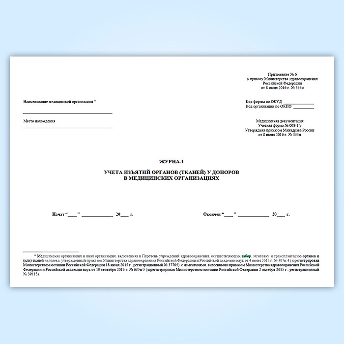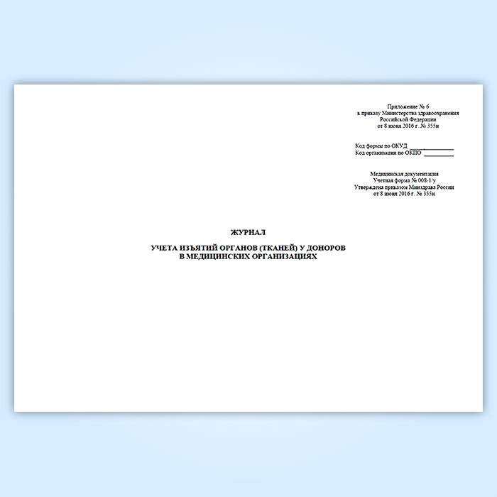 Форма журнала учета изъятий органов (тканей) у доноров в медицинских организациях (№ 008-1/у) соответствует Приложению № 6 к приказу Министерства здравоохранения Российской Федерации от 8 июня 2016 г. № 355н