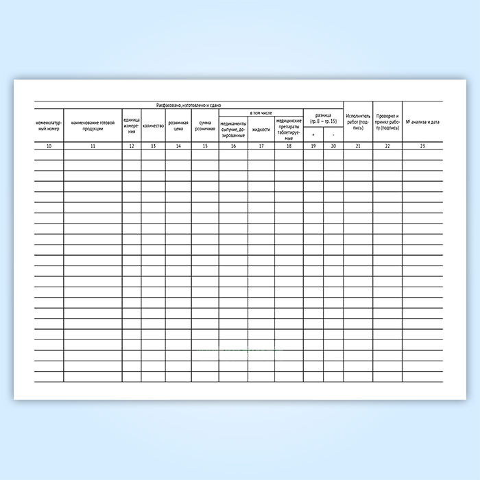 В графе 7 показывается розничная цена товара (сырья) и посуды, выданных для фасовки, а в графе 14 - фактическая розничная цена за единицу фасовки готовой продукции исходя из розничной стоимости медикаментов (сырья) и упаковки.