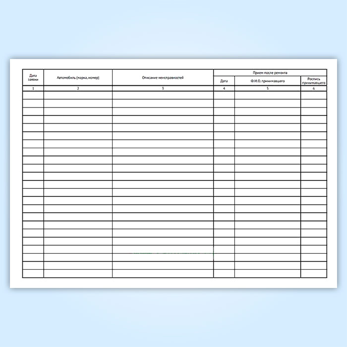 В журнал учета неисправностей автомобилей заносится информация о характере неисправности автомобиля, о выполненных работах, связанных с техническим обслуживанием автомобиля, а также отметка о приемке автомобиля после устранения неисправности.