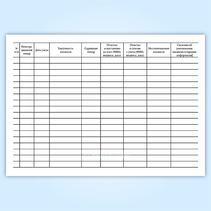 Форма журнала учета носителей персональных данных соответствует Приложению 8 к Методическим рекомендациям по выполнению законодательных требований при обработке персональных данных в организациях банковской системы Российской Федерации (утв. Банком России, АРБ, Ассоциацией региональных банков России (Ассоциация "Россия").