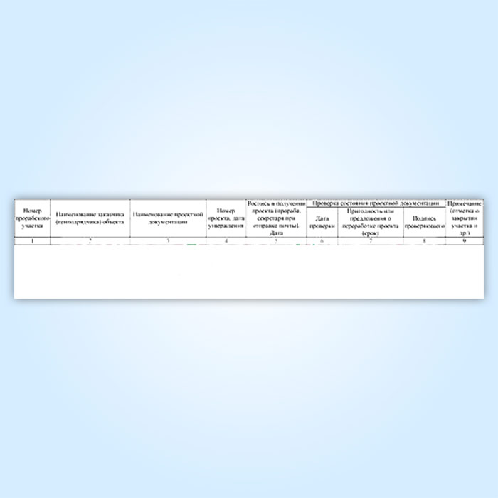 Журнал учета проектной документации буровзрывных работ соответствует Приложению 1 к "ВСН 499-87.Проектирование буровзрывных работ", разработанными ордена Трудового Красного Знамени трестом Союзвзрывпром Минмонтажспецстроя СССР (канд. техн. наук И.З. Дроговейко, Е.М. Двоскин, канд. техн. наук В.Л. Барон, М.А. Григорьева).