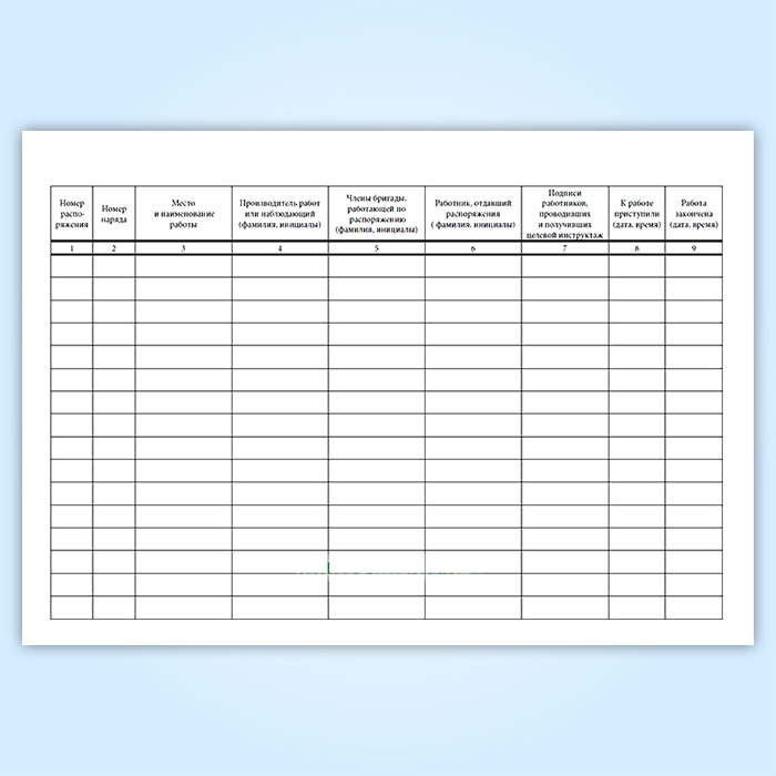 Форма журнала учета работ по нарядам и распоряжениям соответствует Приложению 2 к Правилам техники безопасности при эксплуатации теплопотребляющих установок и тепловых сетей потребителей.